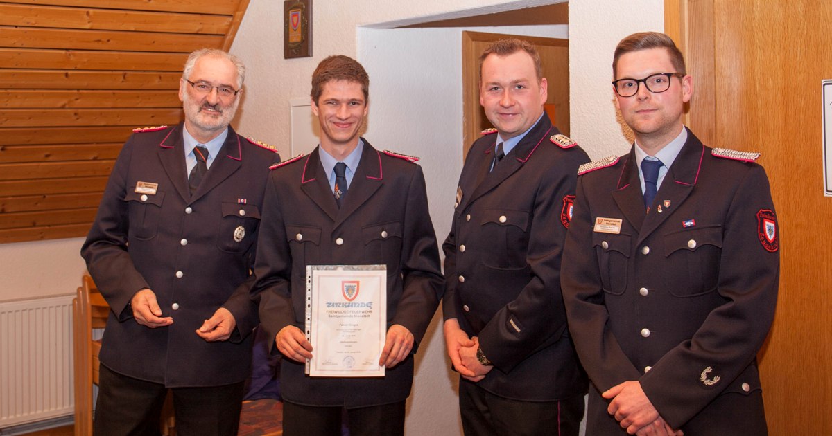 Foto 1: Fabian Grages (2.v.li.) wird von Samtgemeindebrandmeister Dieter Sebode (v.li.) Tobias Bruns und Sebastian Brandt befördert.
