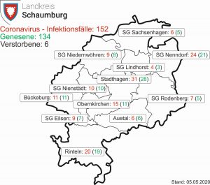 Landkreis (mm-05.05.20). Der Landkreis berichtet, dass mit Datum vom 05.05.2020 derzeit im Landkreis Schaumburg unverändert 12 Menschen akut an Covid-19 erkrankt sind. Seit dem ersten bestätigten Fall gibt es insgesamt im Kreisgebiet 152 Personen mit einer bestätigten Corona-Infektion.
