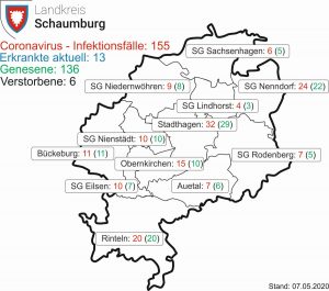 Landkreis (mm-07.05.20). Die Landkreisverwaltung teilt mit, dass mit Datum vom 07.05.2020 derzeit im Landkreis Schaumburg 13 Menschen akut an Covid-19 erkrankt sind. Seit dem ersten bestätigten Fall gibt es insgesamt im Kreisgebiet 155 Personen mit einer bestätigten Corona-Infektion.