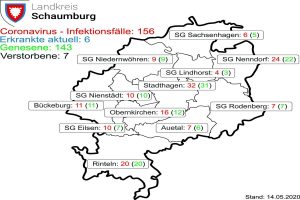 Landkreis (mm-14.05.20). Auch mit Datum vom 14.05.2020 sind im Landkreis Schaumburg unverändert 6 Menschen akut an Covid-19 erkrankt. Bis heute gibt es insgesamt im Kreisgebiet – seit dem 08.05.2020 gleichbleibend – 156 Personen mit einer bestätigten Corona-Infektion. Die Fälle verteilen sich im Kreisgebiet auf alle Städte, Samtgemeinden und die Gemeinde Auetal; vgl. dazu die Aufschlüsselung in der beigefügten Karte (Foto).