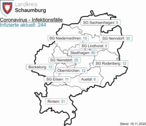 Landkreis (mm-18.11.20). Mit Datum vom 18.11.2020, 7.00 Uhr, sind im Landkreis Schaumburg 244 Menschen akut mit dem Coronavirus infiziert; vgl. dazu die Aufschlüsselung in der beigefügten Karte (Foto). Die Zahl der Personen mit einer bestätigten Corona-Infektion ist im Kreisgebiet um 36 Personen auf insgesamt 1.054 gestiegen.