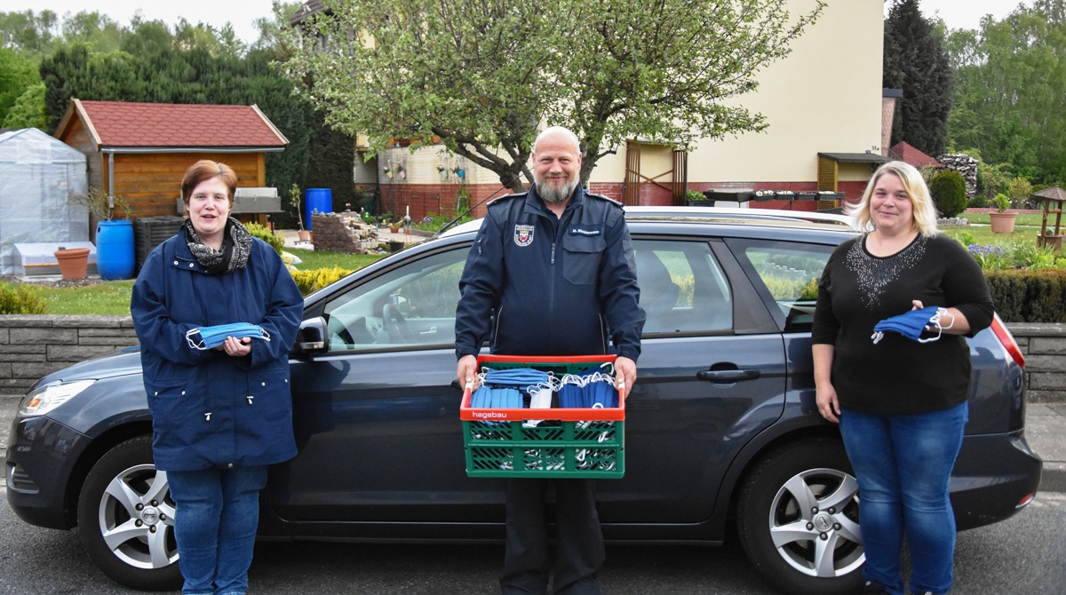 Foto: Yvonne Burger (l.) und Tatjana Adelmann übergaben Stadtzeugwart Marcus Staubermann die rund 350 genähten Alltagsmasken.