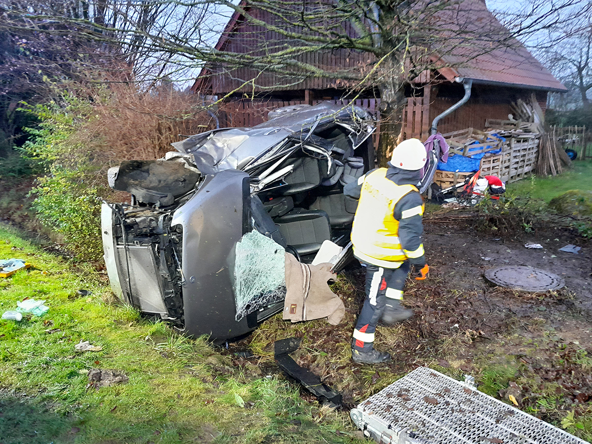 Eine Rusbenderin befuhr mit ihrem PKW die Deinser Straße in Richtung Schierneichen. Aus ungeklärter Ursache kam sie nach rechts von der Straße in einen tieferen Straßengraben ab. Das Fahrzeug prallte dann mit der Beifahrerseite gegen einen Baum und blieb schließlich auf der Fahrerseite liegen. Die Frau zog sich dabei leichte Verletzungen zu, konnte sich aber nicht aus eigener Kraft befreien, eingeklemmt war sie jedoch nicht.
