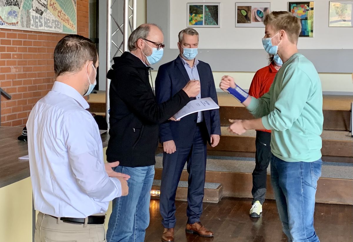 Stellvertretend für die gesamte Klassengemeinschaft, nahmen die Klassensprecher/innen die Zertifikate entgegen. Überreicht wurden die ersehnten Zertifikate durch Alexander Zuschlag, Reinhard Stemme (beide Volksbank in Schaumburg) sowie Jürgen Beimstroh und Timo Kuhlmann (beide IGS Helpsen).