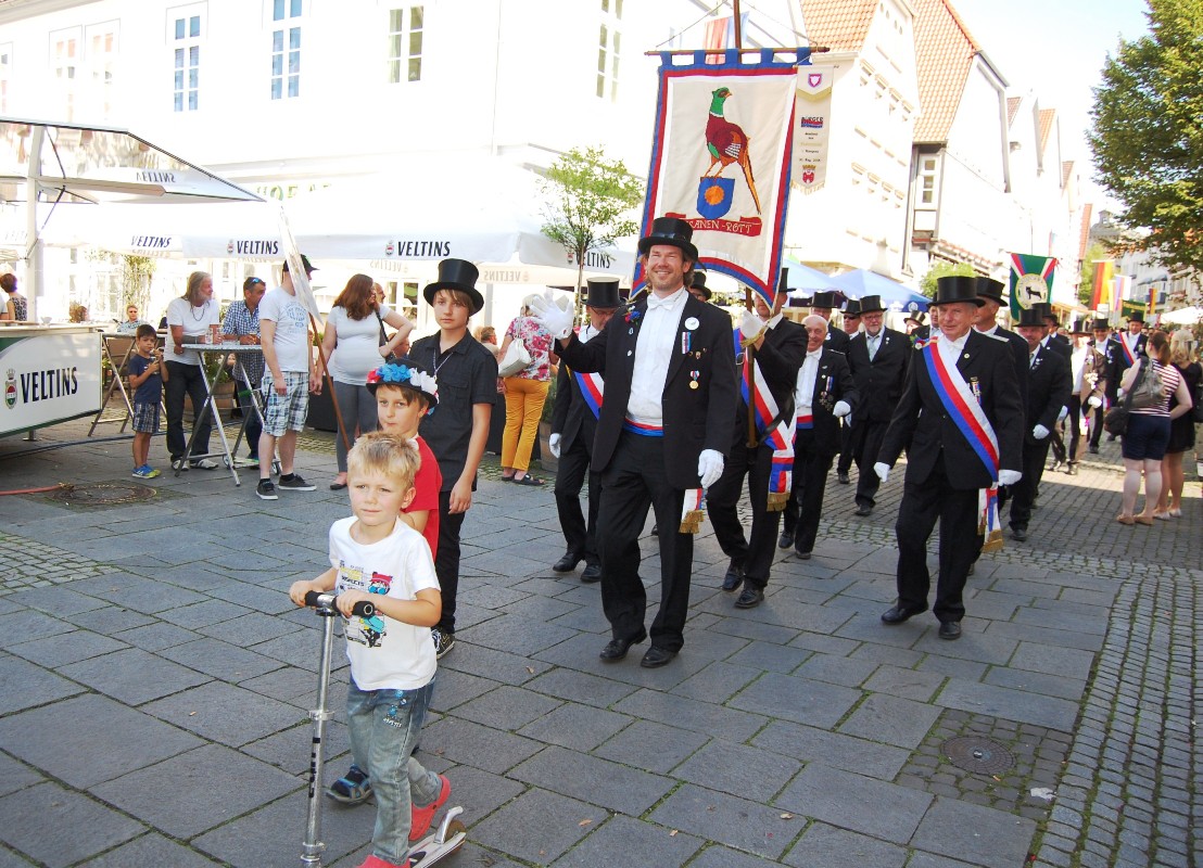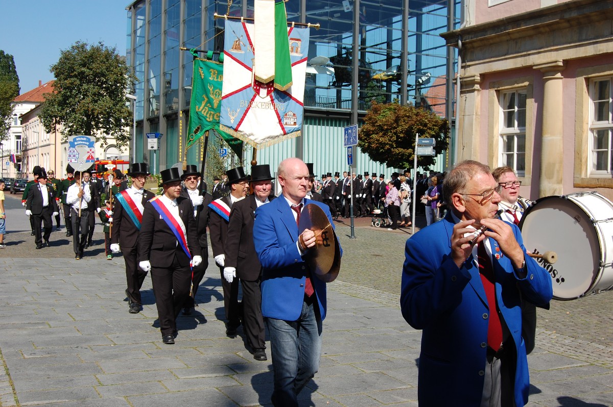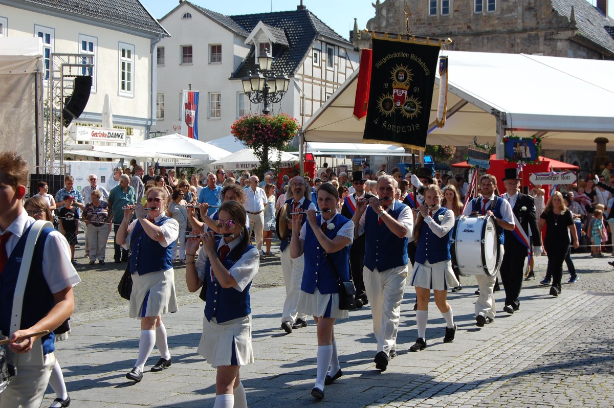 Bückeburg (mm-30.08.15). Mit dem Aufmarsch des Bürgerbataillons mit allen Fahnen, Königskutsche, Spielmannszügen und Musikgruppen auf dem Marktplatz und dem anschließenden „Großen Festumzug“ durch die Fußgängerzone und die Altstadt ist das Bürgerschießen heute Nachmittag zu Ende gegangen.
