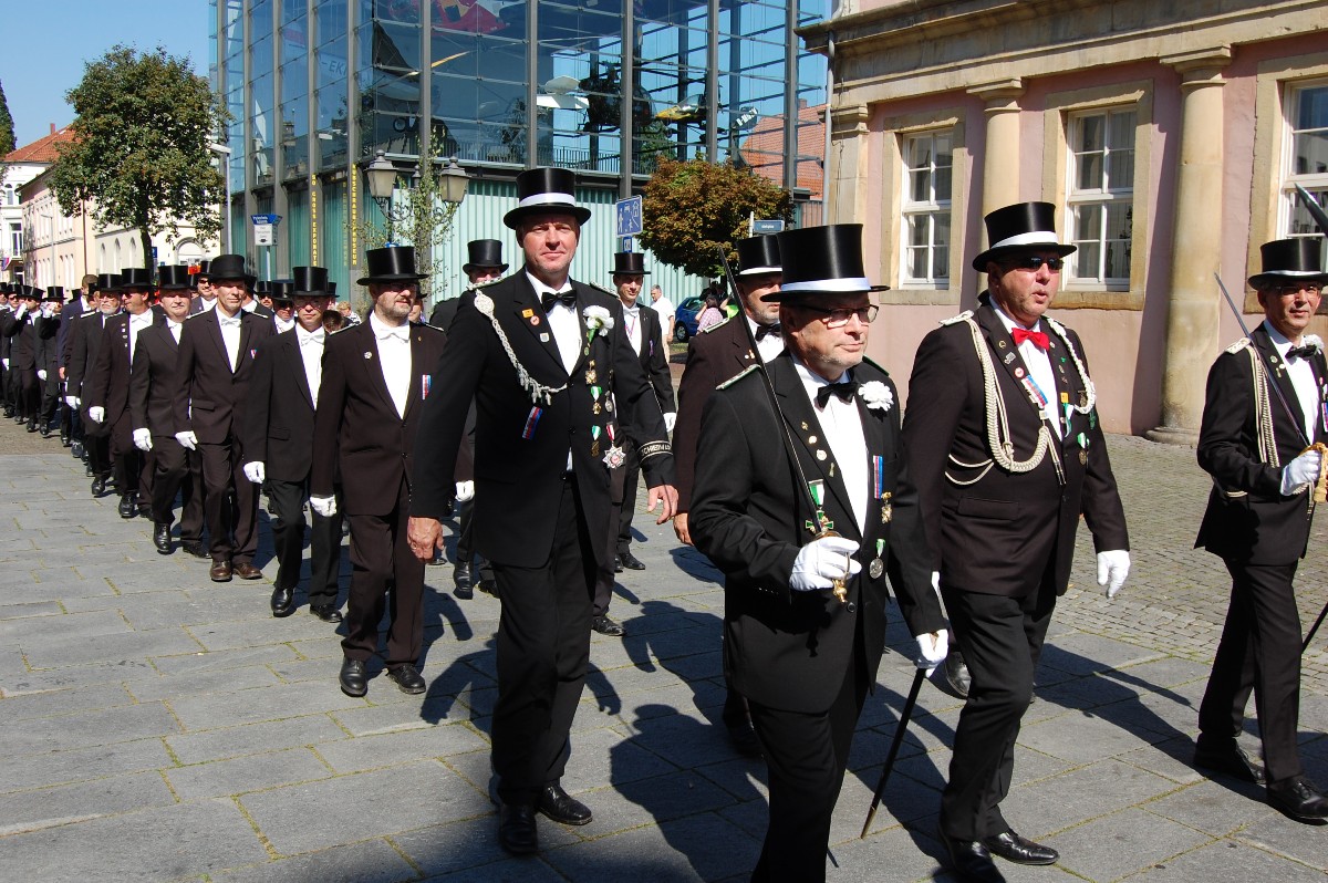 „Herr Stadtmajor, das Bürgerbataillon ist mit 488 Kameraden zum Festumzug angetreten“, meldete der diensthabende Kompaniechef Heinz-Wilhelm Engelke dem Stadtmajor Martin Brandt. Mit der Königskutsche trafen die neuen Majestäten ein. Der neue Bürgerschützenkönig Georg Zwirkowski schritt in vorderster Reihe mit Bürgermeister Reiner Brombach und Stadtmajor Martin Brandt die Front des Bürgerbataillons ab.