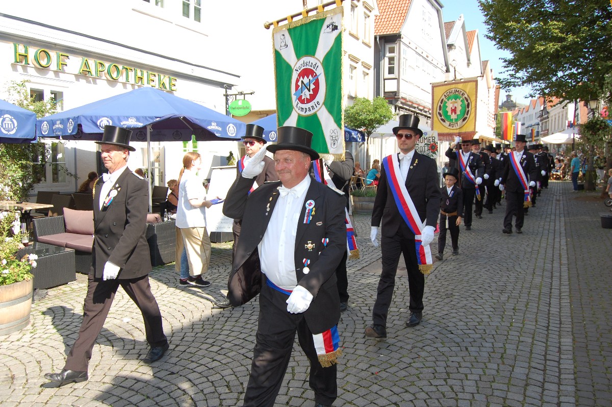 Gegen 14.45 Uhr ertönte aus allen Himmelsrichtungen Musik, die das Eintreffen der Kompanien ankündigte. Im Rathaus hatte auf Einladung der Stadt ein Empfang für die Ehrengäste stattgefunden. Einige hundert Zuschauer hatten sich auf dem Marktplatz eingefunden, suchten unter dem Zelt ein Platz im Schatten und warteten bei Bier und Bratwurst auf den Beginn des Festakts.