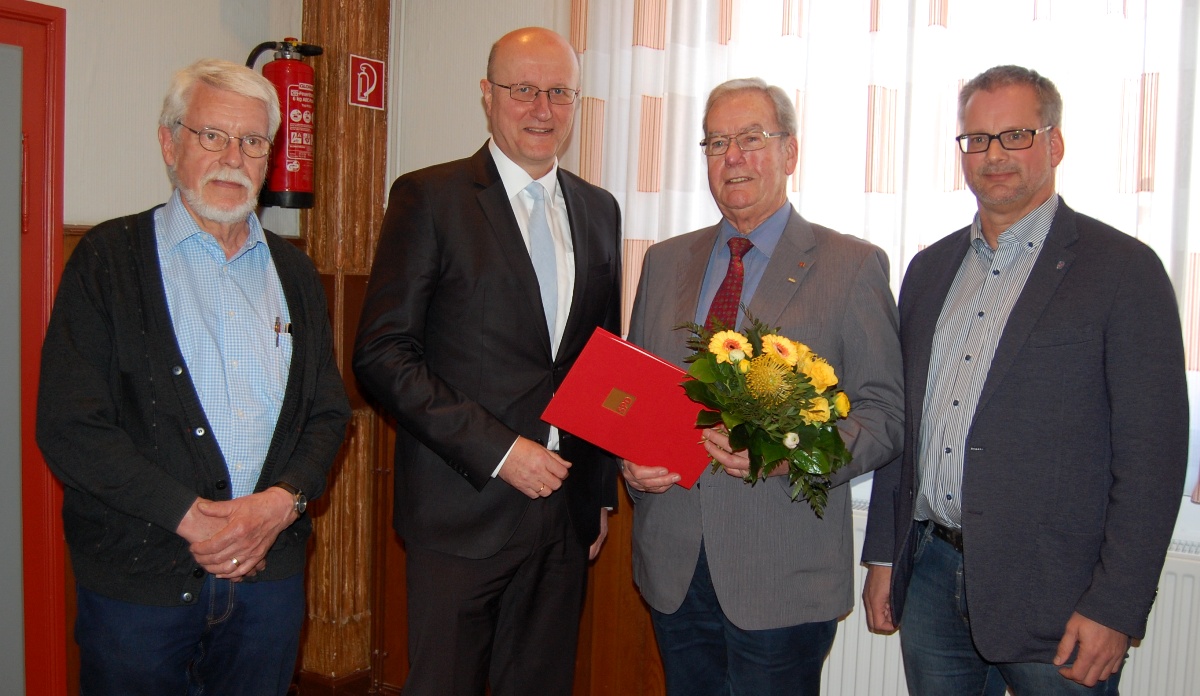 Foto 3: Ernst Kastning (2.v.re.) wird für seine 60-jährige Mitgliedschaft in der SPD von Albert Brüggemann (v.li.), Karsten Becker und Jens Meier geehrt.