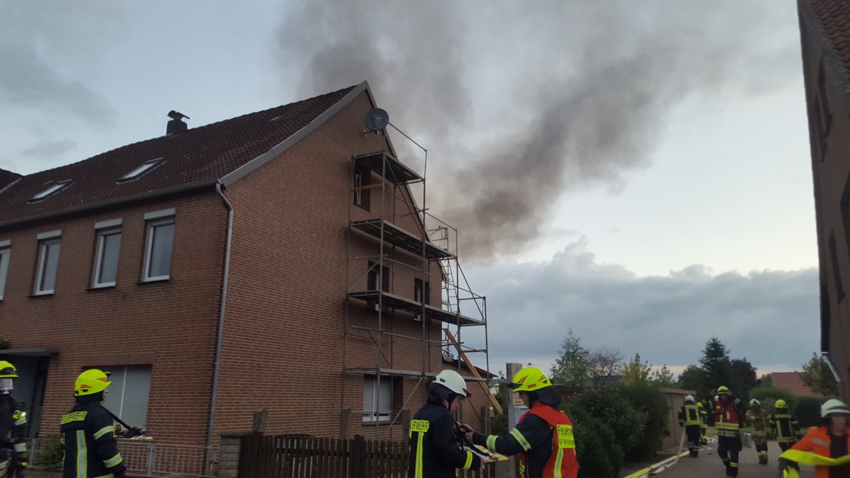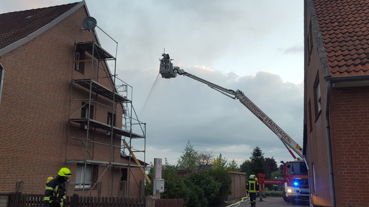 Seitens der Feuerwehr gingen mehrere Trupps unter Atemschutz zur Brandbekämpfung vor. Zusätzlich wurde das Feuer von der Hubrettungsbühne Stadthagen aus bekämpft. Ebenfalls zum Einsatz kamen Hochdrucklüfter. Mit Hilfe von Wärmebildkameras wurde das Dach und die Fassade auf Glutnester überprüft. Nach gut 90 Minuten war das Feuer gelöscht. Im Einsatz waren insgesamt rund 90 Einsatzkräfte der Hilfsorganisationen. Zur Brandursache und Schadenshöhe können keine Angaben gemacht werden. Die Polizei hat die Ermittlungen aufgenommen. Foto: FF SG Sachsenhagen