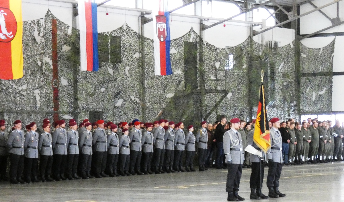 Nach dem Regimentsgruß und einem Musikstück bedankte sich Brigadegeneral Klein in seiner Ansprache bei allen Gästen. Er bedankte sich an erster Stelle bei den nationalen und internationalen Kameraden und sagte, dass nicht er im Mittelpunkt stehen würde, sondern sie, die ihm in allen Zeiten zur Seite gestanden hätten.