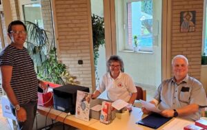 Ellen und Roberto Heller vom Vorstand des DRK Ortsvereins und das Mitglied des Sozialkreises, Gökhan Cistir, bedanken sich bei allen Spendern auch für den flüssigen und reibungslosen Ablauf. Foto: DRK Ortsverein