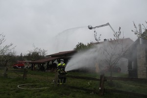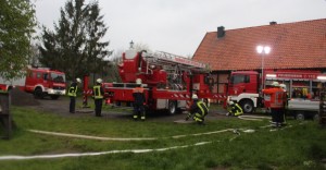 FW alarm 28.04.16 03Die Besatzungen des Tanklöschfahrzeuges und des Rüstwagens begannen gemeinsam mit Kräften aus Rusbend mit der Sicherung der Nachbargebäude. In Panik flüchteten zwei Kinder nach Brandausbruch vom Ereignisort. Dabei stürzte eines in einen Brunnen. Das zweite wies die anrückenden Feuerwehrleute ein. Die Besatzung des Löschgruppenfahrzeuges aus Meinsen-Warber-Achum setzte eine Steckleiter in den Schacht. Anschließend stieg ein Feuerwehrmann unter Atemschutz mit einer Leine gesichert in den Brunnenschacht und rettete die Person.