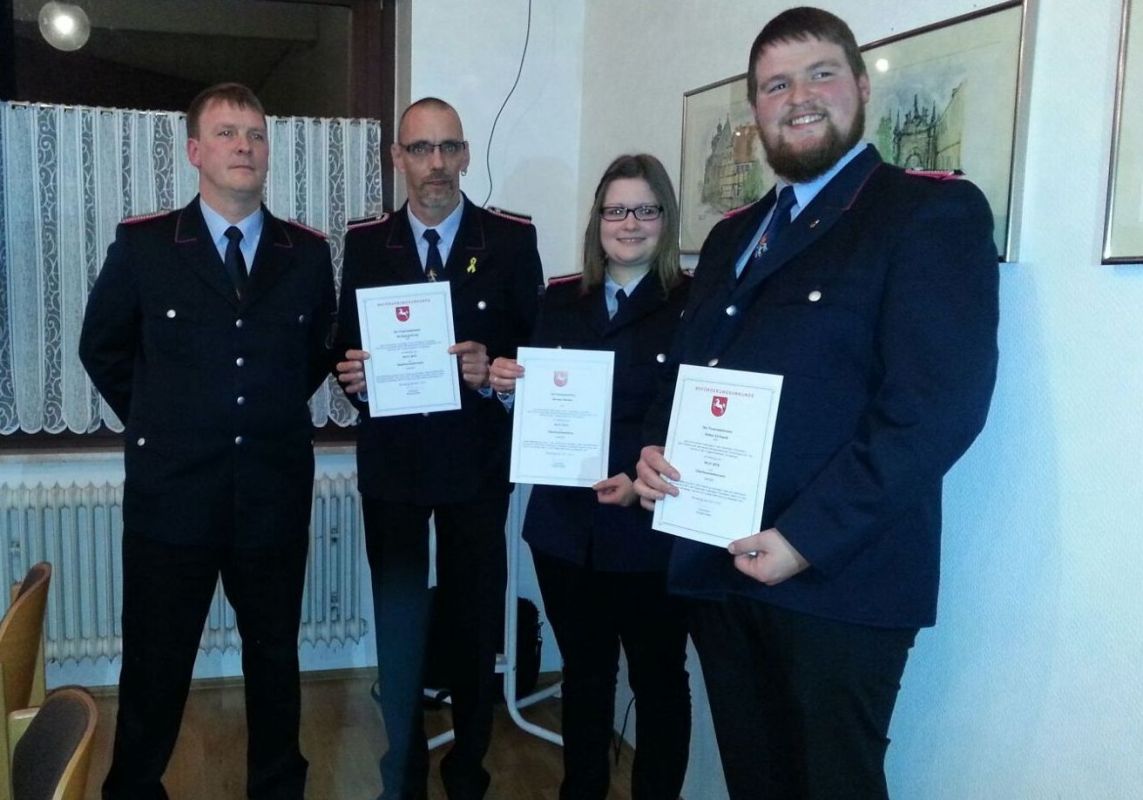 Foto 4: Ortsbrandmeister Volker Janze (v.li.) befördert Wolfgang König, Noreen Weißer und Stefan Ehrhardt.