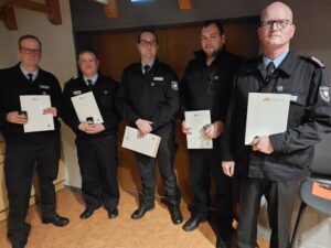 Die Feuerwehrehrennadel des Landesfeuerwehrverbandes Niedersachsen in Silber erhielten Björn Wilharm und Björn Ernst. Die Ehrennadel in Bronze ging an Claus-Dieter Lorenz-Ritter, Patrik Möller, Nils Lösecke und Alexander Ehlers.