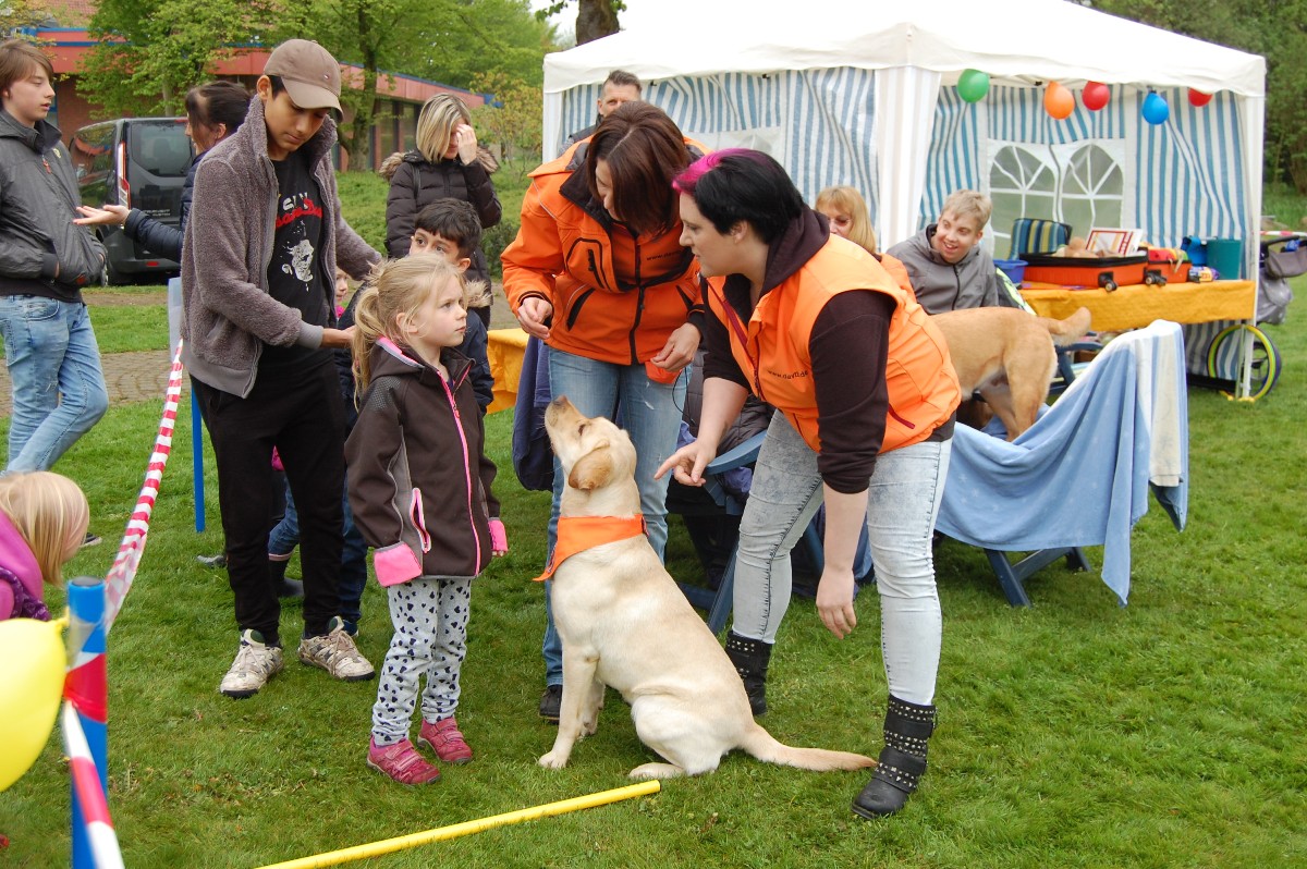 Das Therapieteam Thiemann aus Hespe stand den ganzen Tag über für Informationen rund um die Tiergestützte Therapie zur Verfügung. Man arbeitet mit Kindern im Alter von sechs bis acht Jahren, um ihnen die Angst vor Hunden zu nehmen. Astrid Thiemann lud mit ihren Therapiebegleithunden Lientje und Azubi Haylee die Kinder zum Mitmachen (Foto) ein. „Wir gehen auch in Einrichtungen mit dementen Bewohnern, um deren noch vorhandene Fähigkeiten zu fördern, wenn sie die Hunde streicheln oder mit ihnen Spielen – der Hund ist dabei unser Türöffner“, erläuterte Ulrike Thiemann.