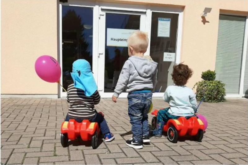 Bückeburg (mm-12.06.20). Zum Start der Kooperation zwischen der Julianen-KiTa Hannoversche Straße und der Seniorenresidenz Am Kirschgarten besuchte eine Krippengruppe der KiTa die Residenz am Kreisel der Scheier Straße. Bei einem ersten Kennenlernen aus reichlicher Entfernung wedelten die Kinder mit Luftballons, brachten Selbstgebasteltes mit und sangen mit ihren Erzieherinnen ein passendes Lied dazu.