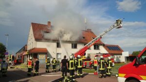 Nach der Begutachtung der Baufachberater sowie einer Begehung, mittels Sicherungsgeschirr über die Drehleiter aus Wunstorf, bestätigte sich die Annahme, dass die Böden instabil sind und eine weitere Brandbekämpfung nur im Außenangriff möglich ist. Um an die Glutnester zu kommen, mussten die Dachziegel entfernt werden. Auch eine Motorkettensäge kam im weiteren Verlauf zum Einsatz.