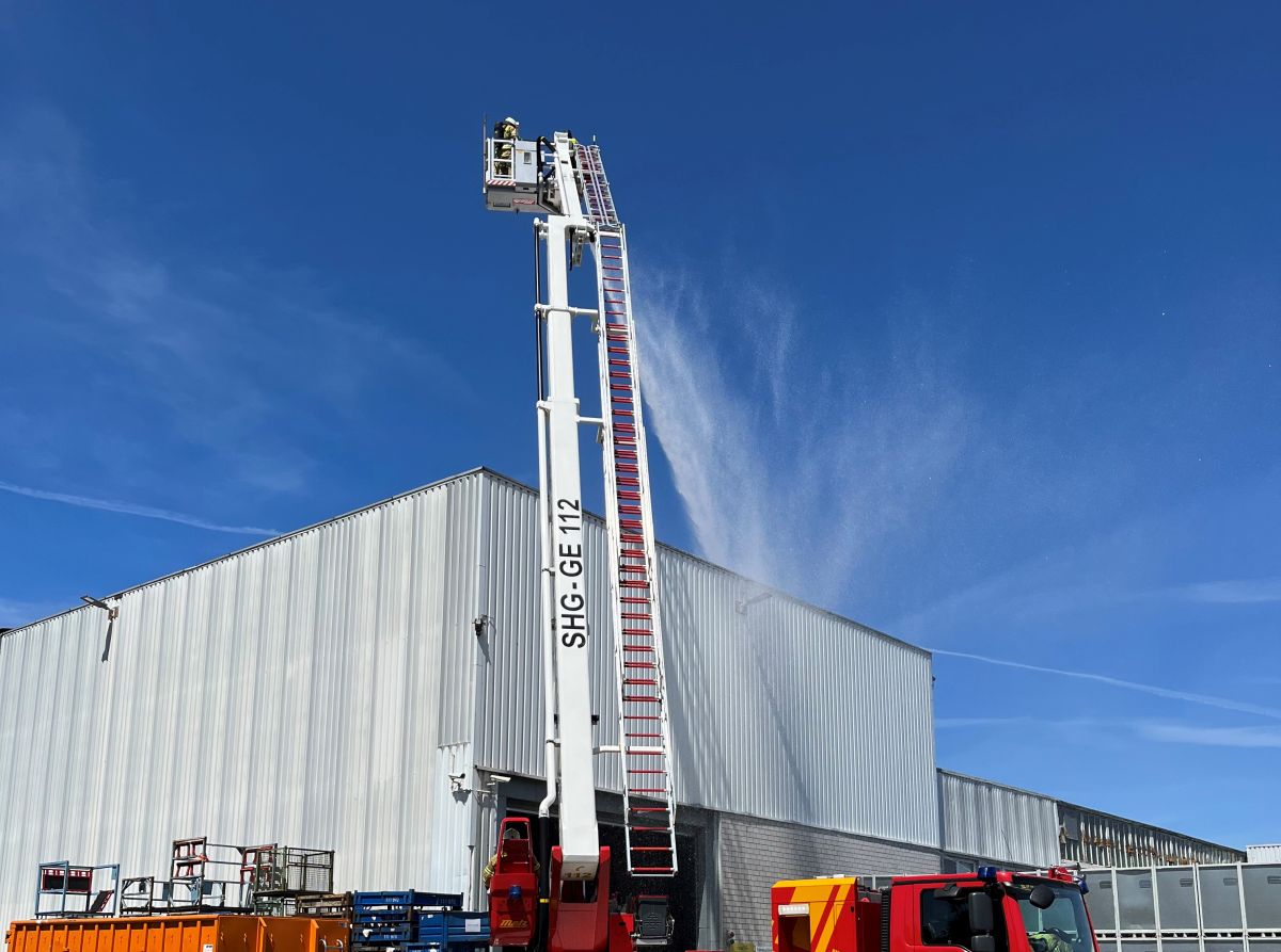 Die Kräfte vor Ort begannen umgehend mit einem Löschangriff über die Hubrettungsbühne. Das Feuer war im Bereich einer Photovoltaik-Anlage und hatte sich bereits durch das Dach in den Innenbereich der Halle durchgefressen. Zusätzlich wurde deswegen umgehend das Feuer auch in der Halle bekämpft.
