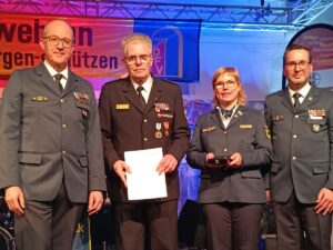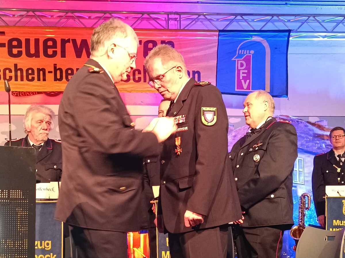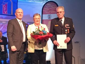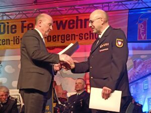Karl-Heinz Banse lobte Grotes Engagement: „Du spielst eine sehr, sehr starke Rolle bei den Feuerwehren. Du bist kein stiller Beisitzer gewesen. Ein besonderer Dank gilt auch Bärbel und Deiner Familie.“ Banse zeichnete Grote mit der goldenen Ehrennadel des Deutschen Feuerwehrverbandes aus.