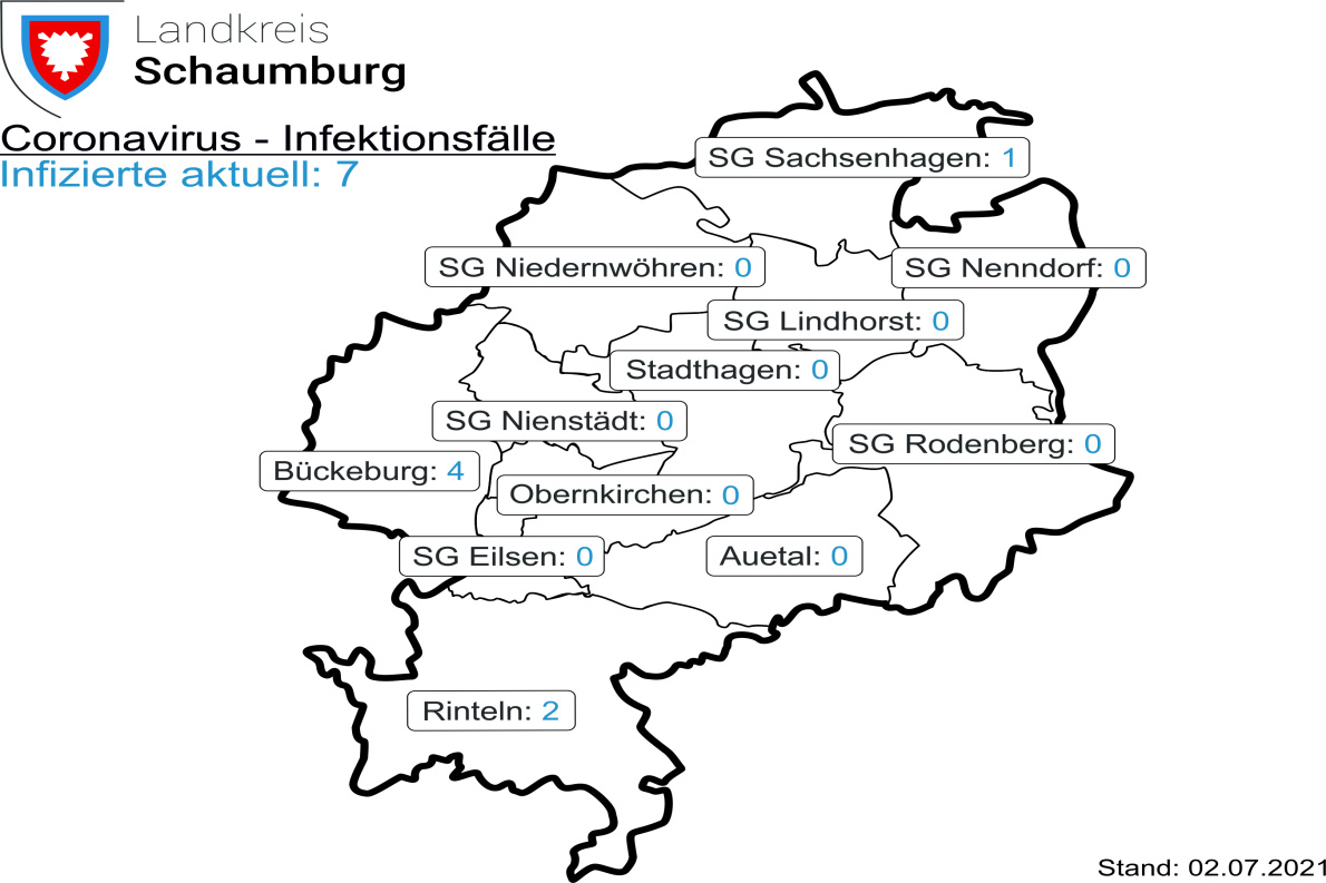 Landkreis (mm-02.07.21). Mit Datum vom 02.07.2021 sind im Landkreis Schaumburg 7 Menschen akut mit dem Coronavirus infiziert; vgl.dazu die Aufschlüsselung in der beigefügten Karte (Foto). Die Zahl der Personen mit einer bestätigten Corona-Infektion ist im Kreisgebiet seit gestern nicht gestiegen und beläuft sich auf insgesamt 4.862.
