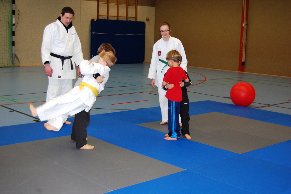 Dann ging es spannend mit den ersten Hüft- und Fußwürfen weiter. Beim Bodenkampf haben die Judoka dann die Chance, den Kampf zu ihren Gunsten zu beenden oder aber sich aus der defensiven Unterlage zu befreien. Gibt es Verletzungsgefahren beim Judo für die Kleinen? „Bei jedem Fußballspiel gibt es mehr Verletzungen als beim Judo“, meinte Zwirkowski.