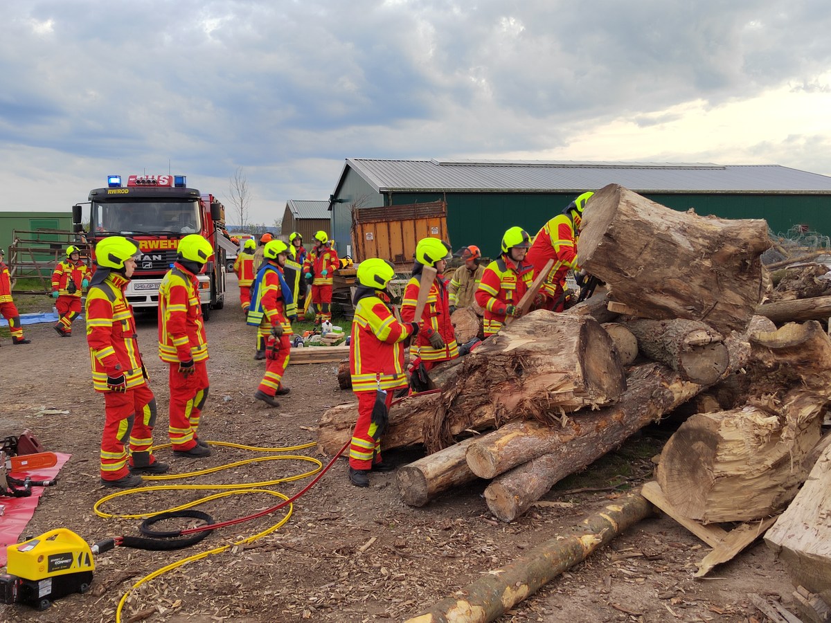 Nach der Ankunft am Gelände wurden die vier Züge nach Einsatzbereichen aufgeteilt: Während in einer vernebelten Maschinenhalle mehrere Personen unter Nullsicht gerettet und eine Brandbekämpfung durchgeführt werden musste, galt es an anderer Stelle, zwei verschüttete Personen unter massiven Holzstämmen zu retten. Weitere Personen mussten nach einem Dacheinsturz von einem meterhohen, losen Maishaufen gerettet werden, zudem galt es, einen Hund sowie zwei Vermisste zu finden. Währenddessen bestand die Aufgabe darin, eine Wasserversorgung vom Mittellandkanal aufzubauen.