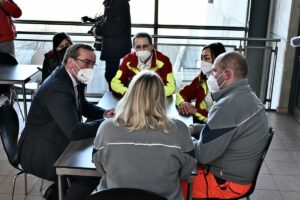 Kürzlich hat sich der Niedersächsische Innenminister Boris Pistorius über die aktuelle Situation auf dem Messegelände informiert. Er machte sich ein Bild von den Abläufen in den Messehallen und informierte sich in Gesprächen mit Mitarbeitenden der Hilfsorganisationen sowie mit einer geflüchteten ukrainischen Familie über die aktuelle Situation vor Ort. Foto: ASB Niedersachsen/Tina Düselder
