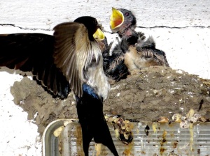Foto 1: Nest der Rauchschwalben mit Jungvögel und Fütterung bei den von Storchs