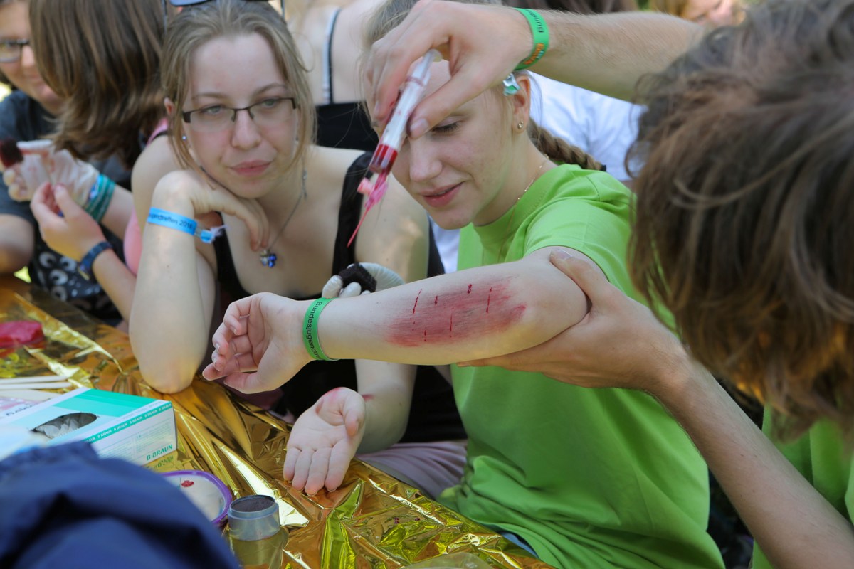 Einmal muss eine Herz-Wiederbelebung an einer Puppe gemacht werden. Ein anderes Mal sind zwei Skaterinnen mit ihren Longboards zusammengeknallt und haben blutende Platzwunden und einen Armbruch davongetragen. An der nächsten Station wurde ein Herzinfarkt an einer Bushaltestelle simuliert. „Es geht auch immer darum, die Meldekette in Gang zu setzen“, erläuterte der Bundesjugendvorsitzende Simon Dagne.