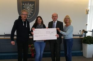 Foto: Scheckübergabe mit Klaus-Peter Grote (v.li.), Silke Weibels, Landrat Jörg Farr und Ursula Müller-Krahtz