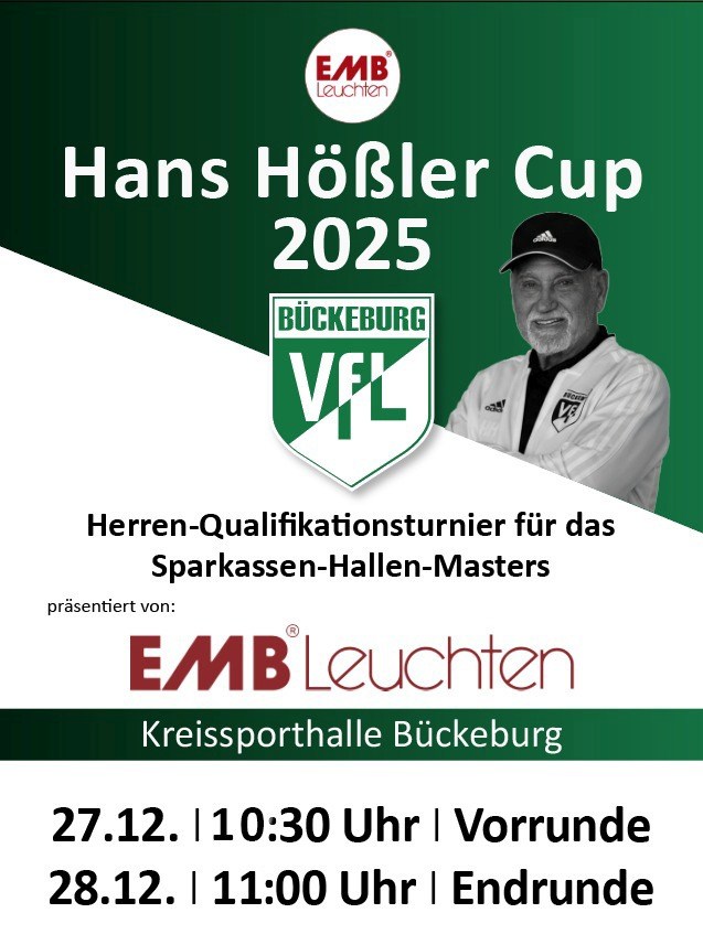 Auch in 2025 wird die Firma EMB-Leuchten das traditionsreiche Hallenfußballturnier des VfL Bückeburg unterstützen. Das Turnier heißt ab diesem Jahr im Gedenken an den langjährigen und in der Schaumburger Fußballszene geschätzten Fußballobmann des VfL – Hans-Hößler – nunmehr EMB – Hans Hößler-Cup. Das Turnier blickt auf eine jahrzehnte lange Tradition zurück und wird zwischen Weihnachten und Silvester ausgetragen – in diesem Jahr komprimiert am 27.12. und 28.12.2025 an zwei Tagen.