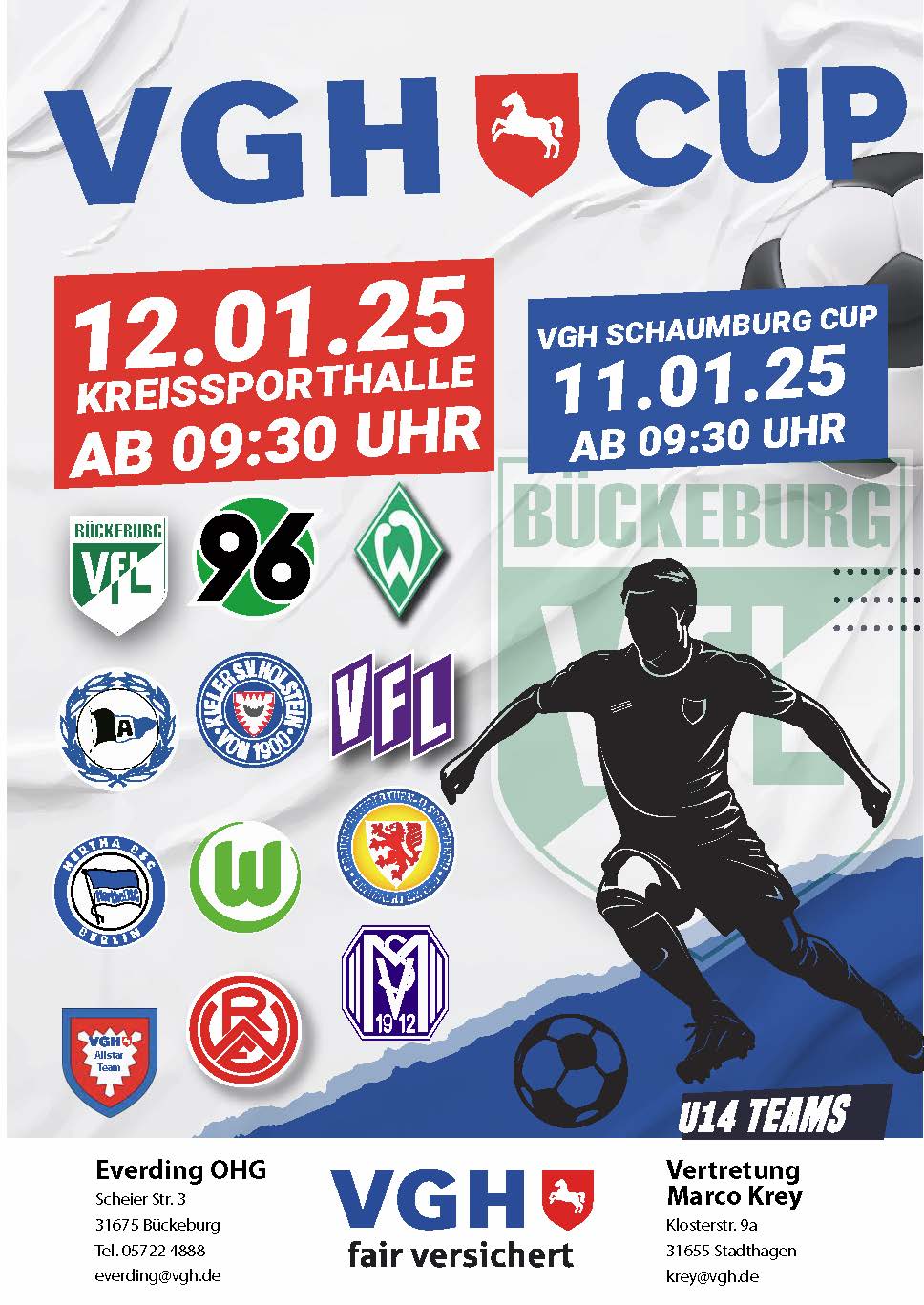 Die Vorbereitungen für den am 11. und 12.01.2025 in der Kreissporthalle Bückeburg stattfindenden VGH-Cup laufen bereits auf Hochtouren, erstmalig gehen am beiden Tagen 12 Teams nach einem neuen Turniermodus an den Start. Alle Beteiligten schauen gespannt auf das im Januar startende Turnierwochenende und wünschen sich eine faire und erlebnisreiche Veranstaltung in Bückeburg.