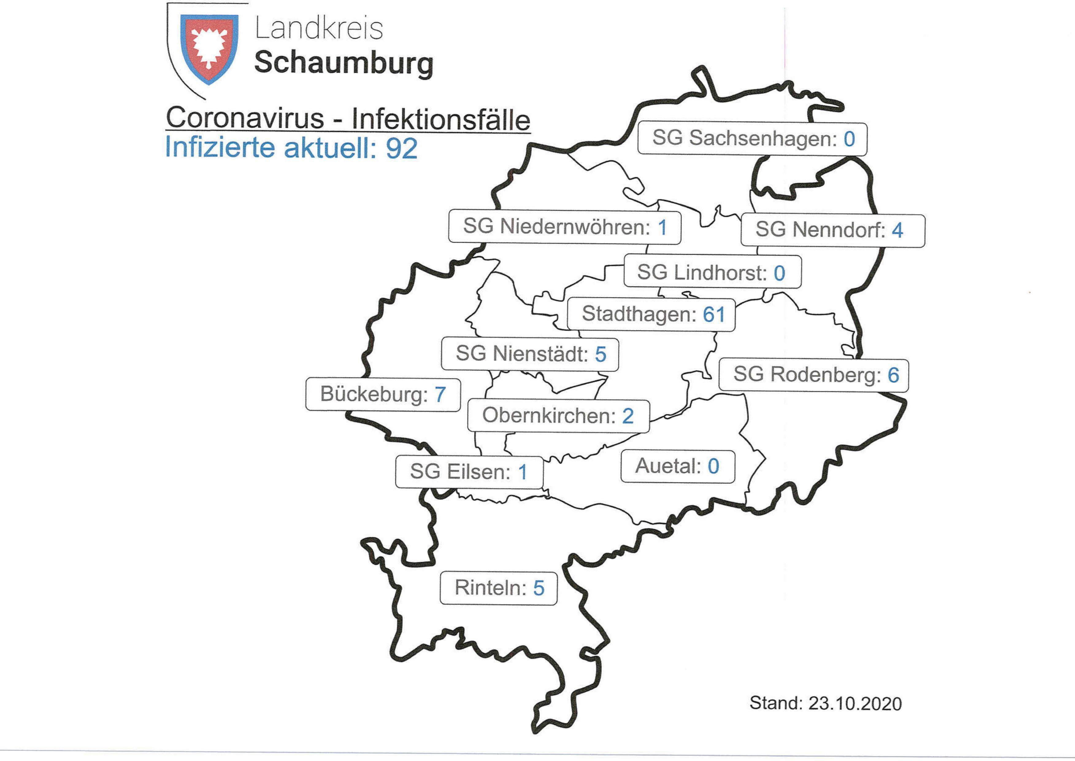 Landkreis (mm-23.10.20). Mit dem heutigen Datum vom 23.10.2020 sind im Landkreis Schaumburg 92 Menschen akut mit dem Coronavirus infiziert; vgl. dazu die Aufschlüsselung in der beigefügten Karte (Foto). Die Zahl der Personen mit einer bestätigten Corona-Infektion ist im Kreisgebiet um 11 Personen auf insgesamt 436 gestiegen.