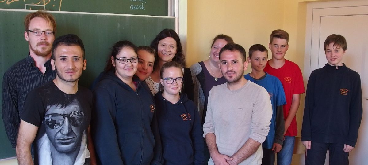 Foto: AWO Sozialarbeiter Michael Hendel und Mia Kaluza, Schulsozialarbeiterin der Immanuel-Schulen, Katharina Falk, Azam und Aziz K. sowie einige Schüler der 9. Klasse der IGS Immanuel-Schule nach der Fragestunde zum Thema „Flüchtlingsarbeit“ im Unterricht.